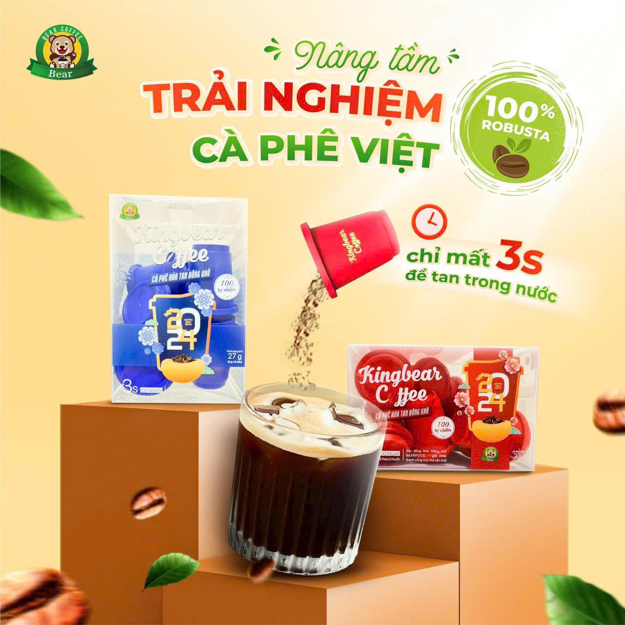 Kingbear Coffee là thương hiệu cung cấp sản phẩm cà phê tạo nên từ công nghệ đông khô (hay còn gọi là bay hơi thăng hoa), giúp cà phê loại bỏ toàn bộ dầu, nước và tạp chất, giữ trọn hương vị tuyệt hảo vốn có. 100% từ hạt cà phê
